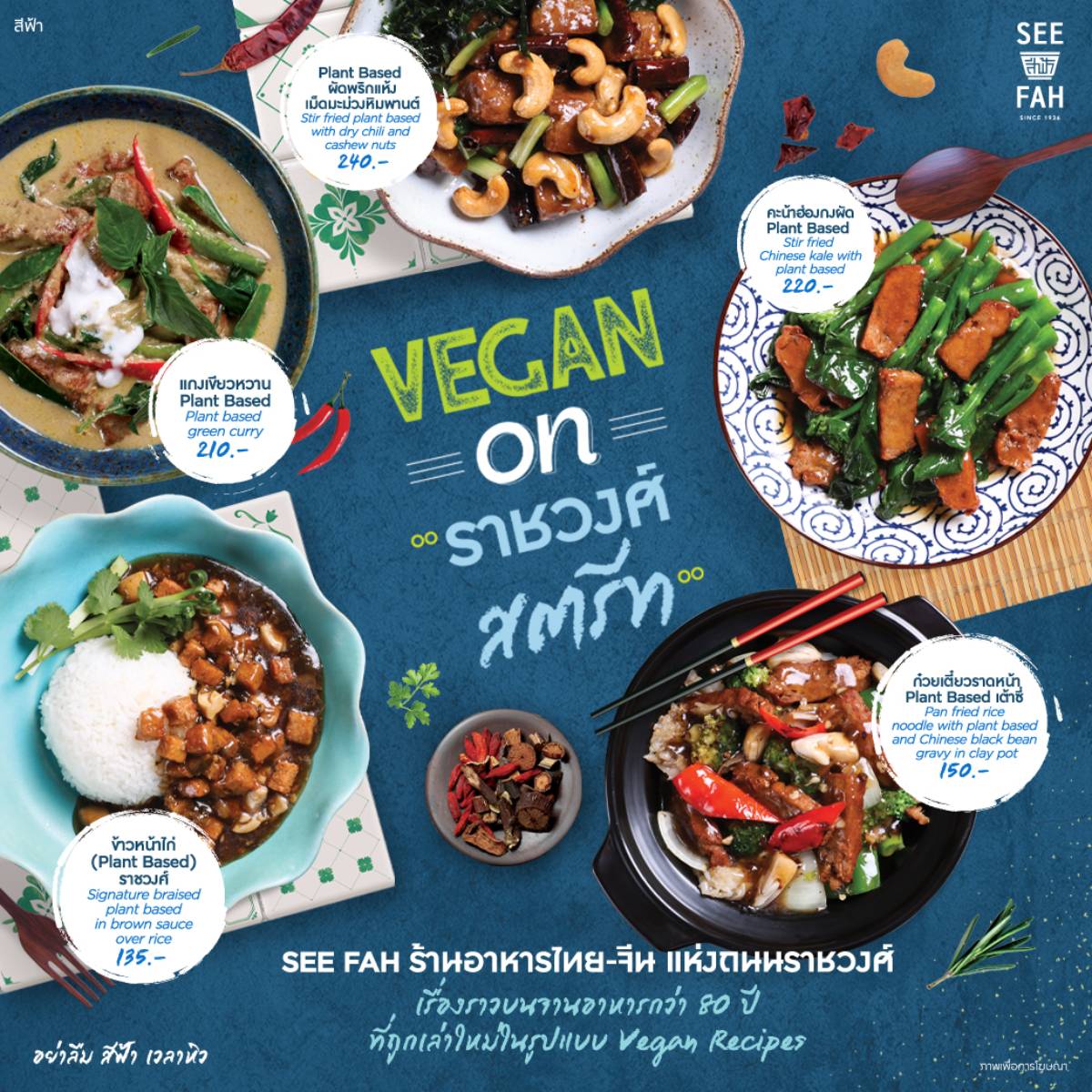 SEE FAH ร้านอาหารไทย – จีน แห่งถนนราชวงศ์ กว่า 8 ทศวรรษ จากยุคบุกเบิกหลากหลายเมนูต้นตำรับ สู่ยุครุ่งเรืองแห่งวิถีวีแกน เกิดเป็นไอเดียในการรังสรรค์จานอาหารต้นตำรับ (จากพืช) 100 % อีก 1 ทางเลือกสายวีแกน เลี่ยงเนื้อสัตว์ วิถีการกินใหม่ได้สุขภาพดี แต่ยังคงรสชาติต้นตำรับฉบับ SEE FAH