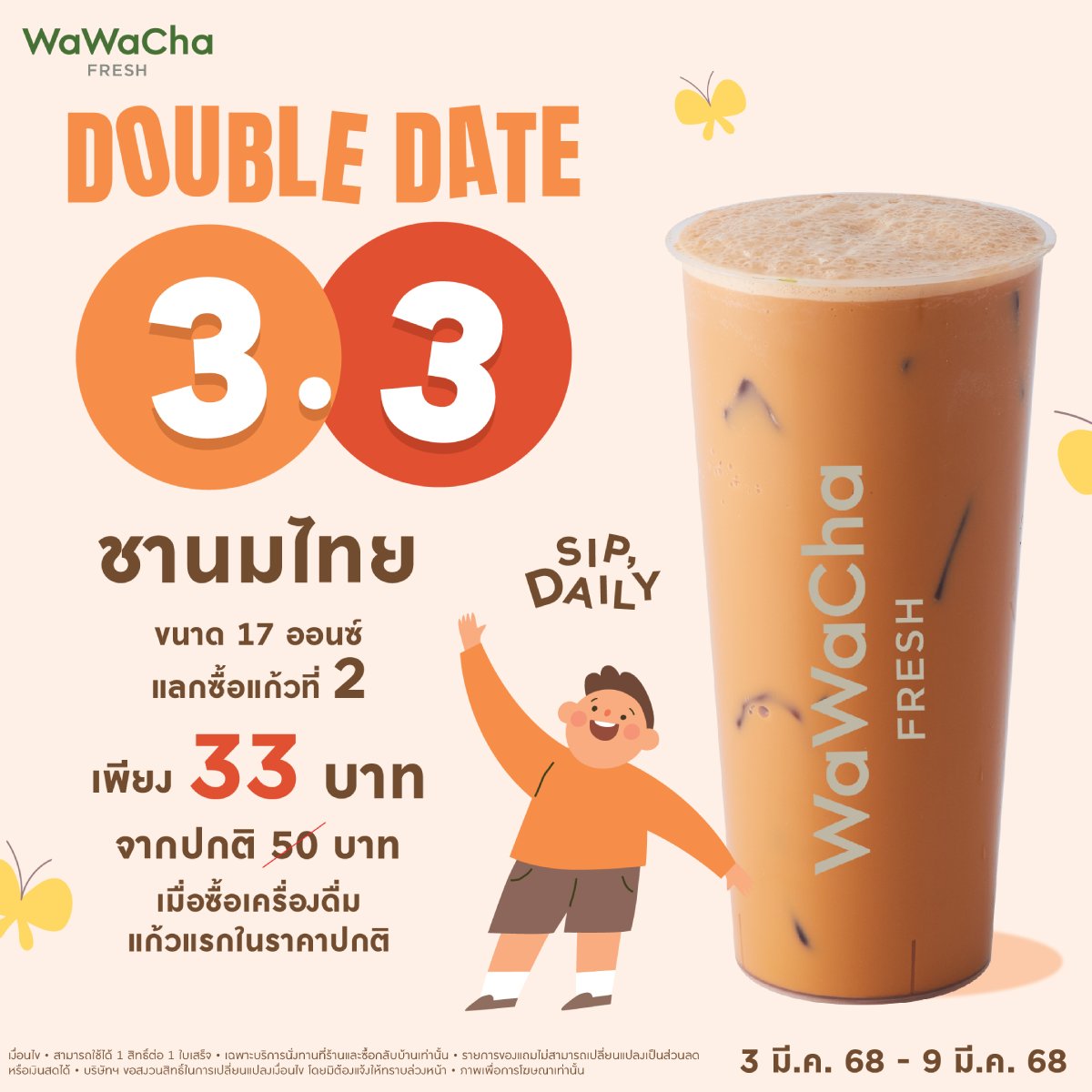 โปรเบิ้ลทั้งปี ต้องโปรเบิ้ลวันนี้ 3.3 วันเลขเบิ้ล แลกซื้อชานมไทย แก้วที่ 2 เมื่อซื้อเครื่องดื่มแก้วแรกในราคาปกติ ที่ Wawa Cha