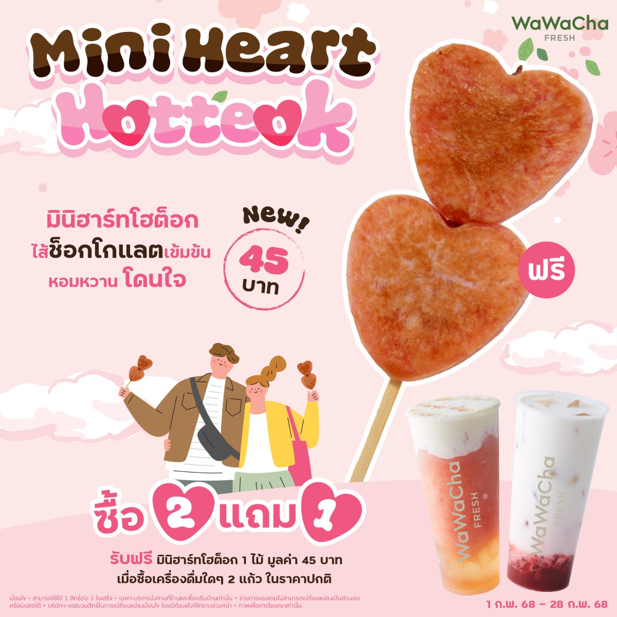 มาร่วมสนุกในวันวาเลนไทน์ที่ร้านของเรา ซื้อ 2 แถม 1 รับฟรี Mini Heart Hotteok 1 ไม้ เมื่อซื้อเครื่องดื่มใดๆ 2 แก้ว ในราคาปกติ Wawa Cha พร้อมสร้างความสุขในทุกๆ แก้ว
