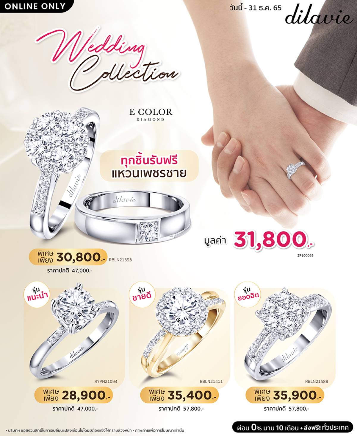 Wedding Collection ทุกชิ้นรับฟรีแหวนชายมูลค่า 31,800.- ใครที่กำลังมองหาแหวนแต่งงานหรือซื้อเป็นของขวัญรับเทศกาลส่งความสุขนี้ รีบจูงมือแฟนแล้วไปช้อปกันเถอะ