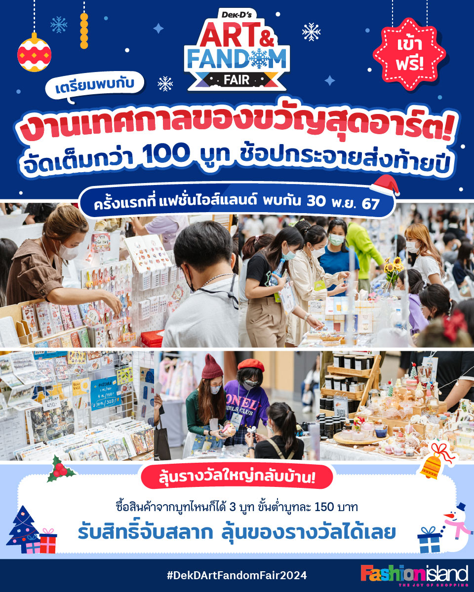 เสาร์ 30 พ.ย.67 นี้ พบกับงานเทศกาลของขวัญสุดอาร์ตไม่ซ้ำใคร #DekDArtFandomFair2024 ช้อปกันให้กระจายปลายปีนี้ Dek-D จัดใหญ่เอาใจชาวรามอินทรา ครั้งแรกที่ แฟชั่นไอส์แลนด์ ณ ไอส์แลนด์ฮอล์ ชั้น 3 เข้าฟรี!