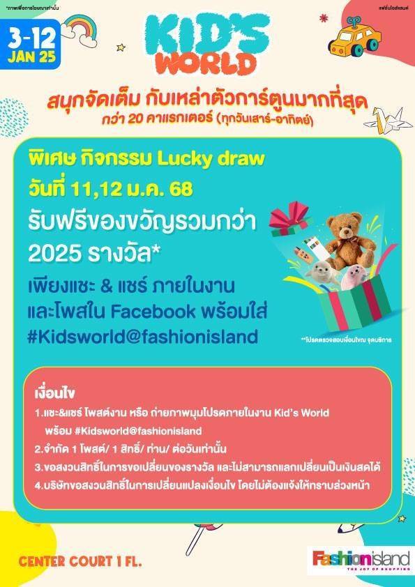 11 & 12 ม.ค. นี้รับฟรีของขวัญรวมกว่า 2025 รางวัล เพียงเเชะ & เเชร์ ภายในงานเเละโพสใน Facebook พร้อมใส่ #Kidsworld@fashionisland