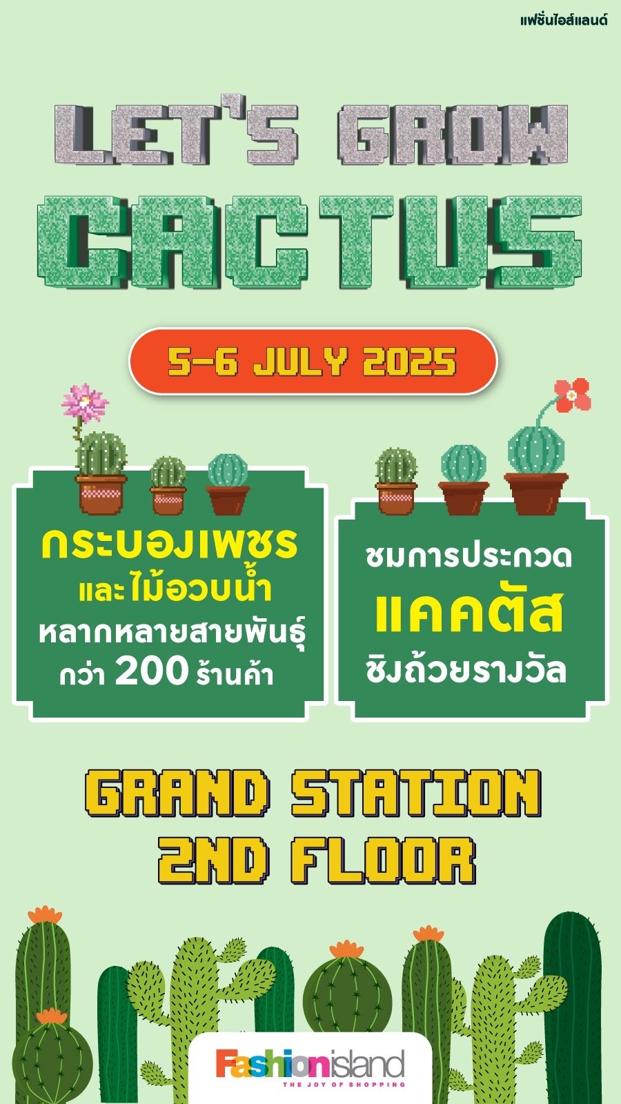 Let’s grow cactus 5-6 กรกฎาคม 2568 งานแฟร์ ที่รวมแคคตัสร้านดังของนักสะสม จากทั่วประเทศและต่างประเทศ มาไว้ที่งานเดียว และยังมีต้นไม้น่ารักๆ น่าสะสมเพียบ กระถางและอุปกรณ์ก็พร้อมเลย ในงาน ประกวดกระบองเพชรสายพันธุ์ต่างๆ ตลอดทั้ง 2 วัน