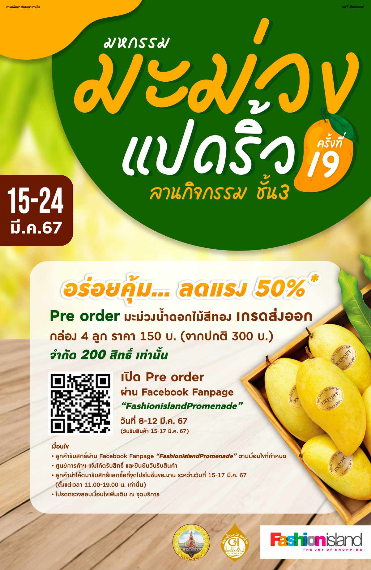 เปิดฤดูกาลแห่งความฉ่ำาาา ในงาน ## มหกรรมมะม่วงแปดริ้ว ครั้งที่ 19 ## ดื่มด่ำชื่นใจ คล้ายร้อน อร่อยยกสวนกับมะม่วงสายพันธุ์ดีที่มากที่สุด คุณภาพส่งออก รวบรวมร้านค้าจำหน่ายมะม่วงสายพันธุ์ต่าง ๆ ผลิตภัณฑ์แปรรูปจากมะม่วง ในราคาย่อมเยา พร้อมโปรโมชั่นพิเศษนาทีทองให้ได้เลือกซื้อกันในราคาสุดคุ้ม