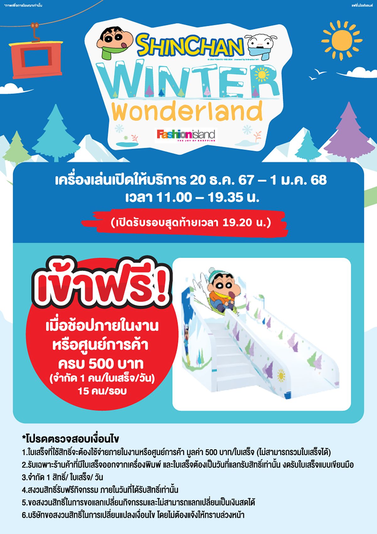 20 ธันวาคม – 1 มกราคมนี้ Fashionisland เตรียมพบกับงาน #ShinchanWinterWonderland ร่วมเฉลิมฉลองไปกับเทศกาลแห่งความสุข #ครั้งแรกในประเทศไทย กับธีม “ชินจังยกก๊วนสนุกตะลุยเเดนหิมะ” การ์ตูนที่ครองใจคนไทยมานาน พร้อมจะเติมเต็มความสุขให้กับทุกคน ไม่ว่าจะเป็นการถ่ายรูปกับมาสคอตชินจัง หรือร่วมกิจกรรมสนุก ๆ ที่เราจัดเตรียมไว้เพื่อทุกคนโดยเฉพาะ