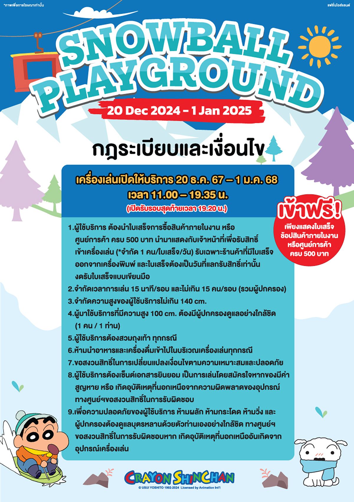 - รับสิทธิ์เข้าเล่นเครื่องเล่น Snowball Playground เมื่อช้อปครบ 500 บาท/ ใบเสร็จ/ 1 คน/ วัน (จำกัด 15 คน/ รอบ) ร่วมกิจกรรมได้ตั้งแต่เวลา 11.00 – 19.35 น.