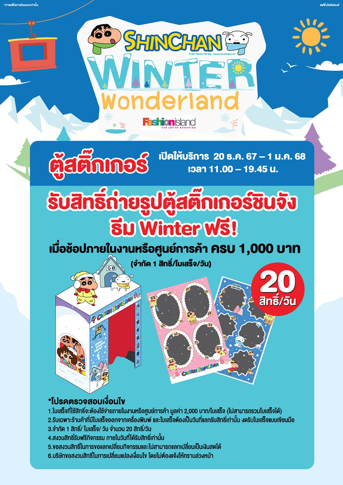 - ฟินกับ Sticker Photo Booth รับสิทธิ์ถ่ายรูปตู้สติ๊กเกอร์ชินจังธีม Winter ฟรี! เมื่อช้อปครบ 2,000 บาท/ ใบเสร็จ/ 1 คน/ วัน (จำกัด 20 สิทธิ์/ วัน) ร่วมกิจกรรมได้ตั้งแต่เวลา 11.00 – 19.45 น.