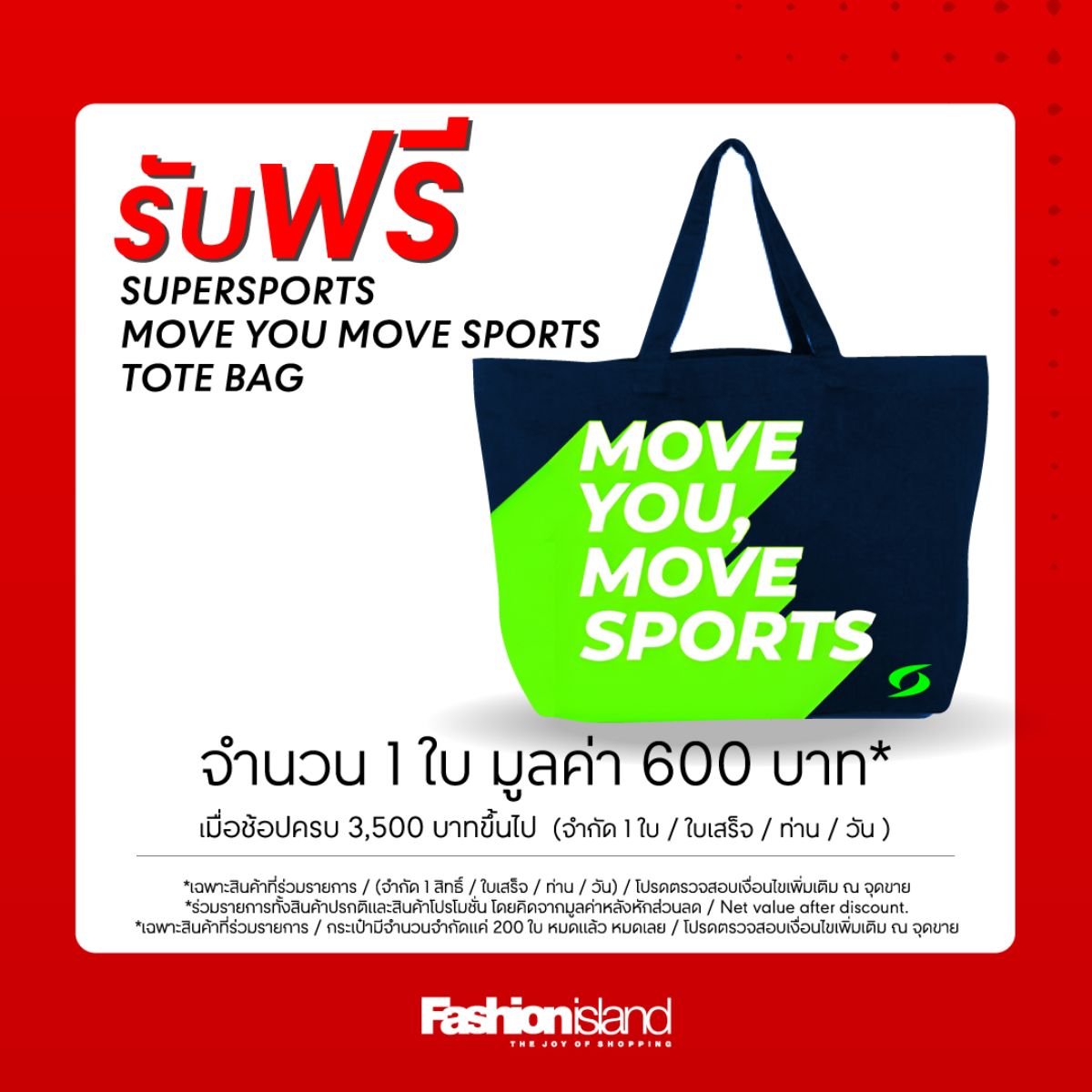 • รับฟรีกระเป๋า Supersports Move You Move Sports Tote Bag มูลค่า 600บาท จำนวน 1 ใบ เมื่อซื้อสินค้าครบ 3,500 บาท (จำกัด 1 ใบ/ ใบเสร็จ/ ท่าน/ วัน)