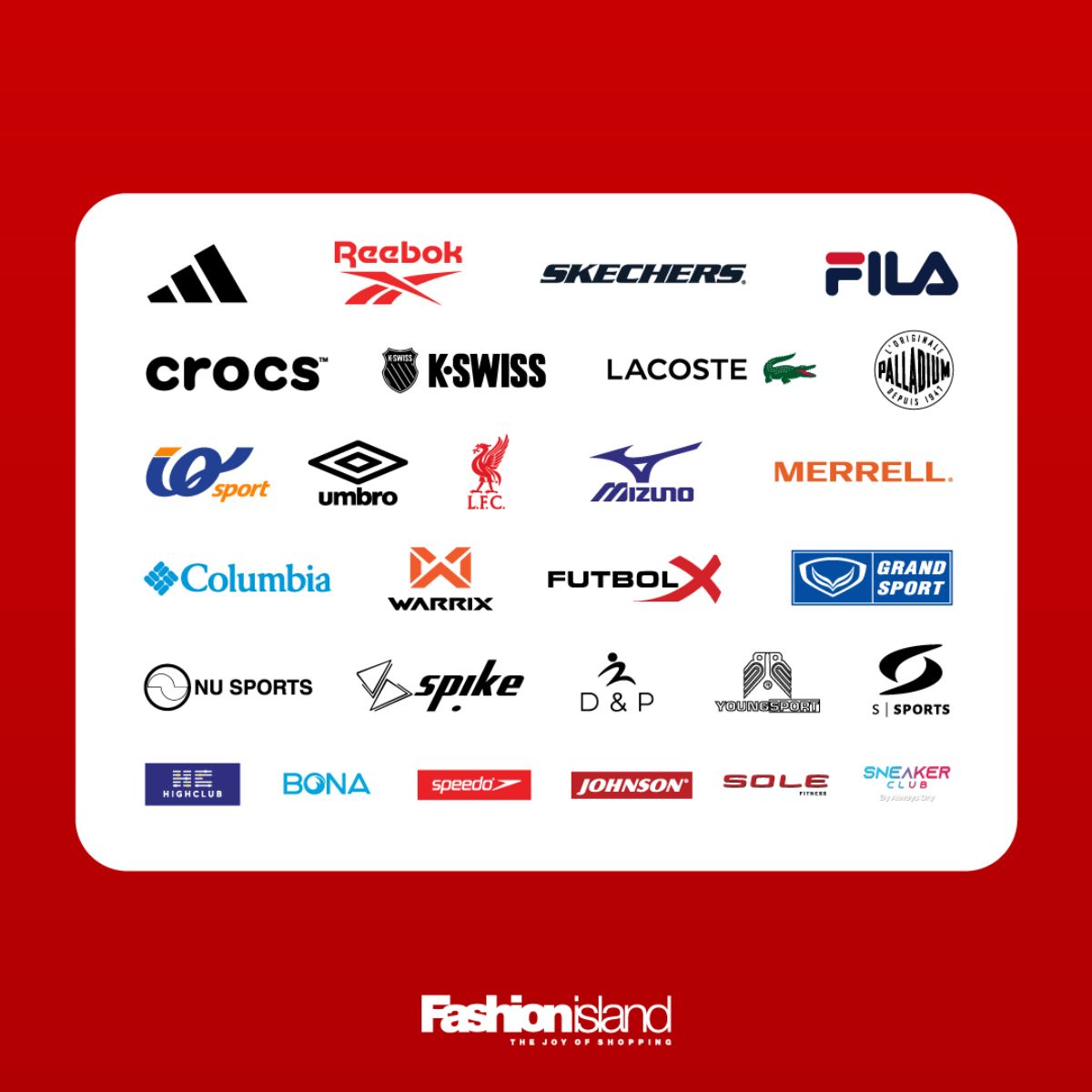 พบกับสินค้าเสื้อผ้า, รองเท้า, และอุปกรณ์กีฬาจากแบรนด์ชั้นนำ อาทิ Adidas, Always dry, BONA, Columbia, Crocs, D&P, Young sport,Fila, FUSEN, Futbolx, Grand sports, HIGHCLUB, IQ Sport, JOHNSON, K swiss, Lacoste, LFC, Merrell, MIZUNO, Nusport, PALADIUM, Reebok, S Sports, Skechers, Speedo, Spike, Umbro, Warrix และอีกมากมาย