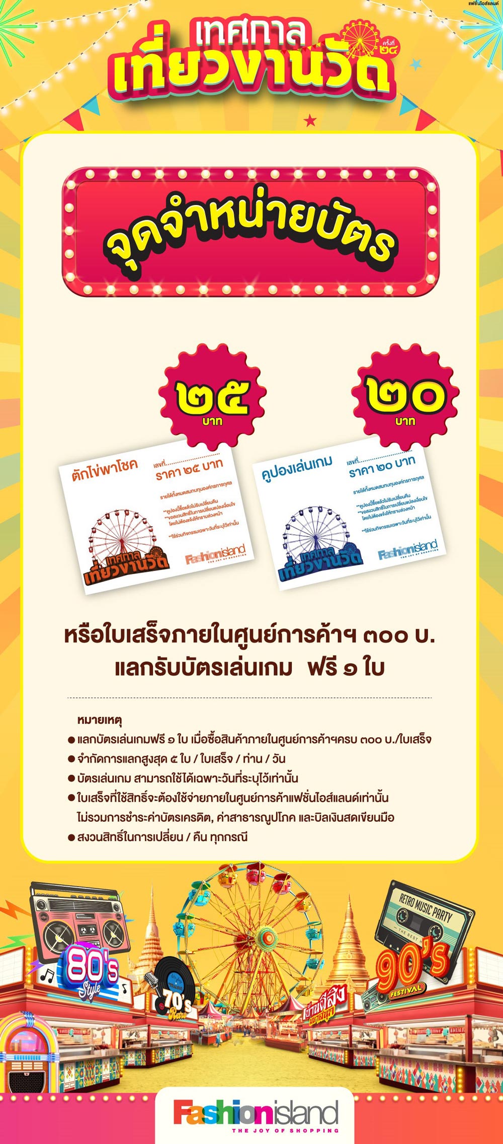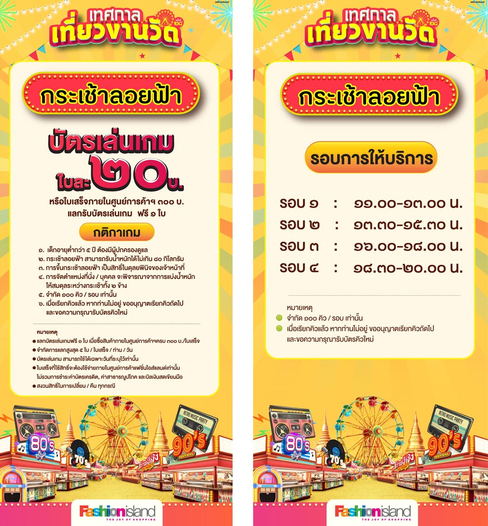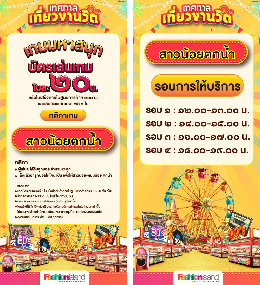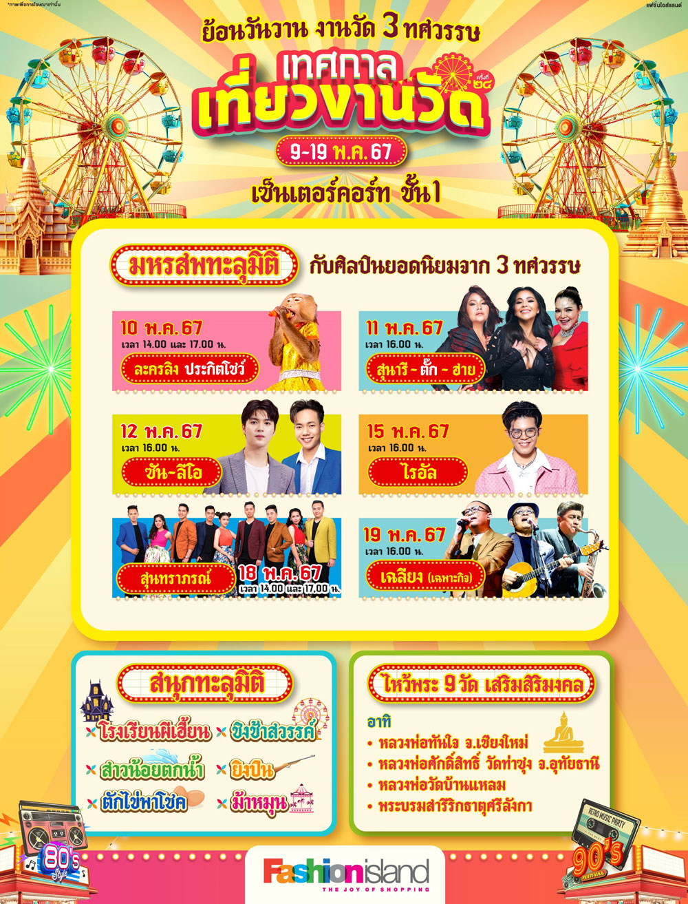 เริ่มวันที่ 9 – 19 พฤษภาคมนี้ที่ Fashionisland พร้อมพาคุณสนุกทะลุมิติ ย้อนวันวานไปกับงานวัด 3 ทศวรรษ ยุค 70s 80s และ 90s งานวัดสุดปังโด่งดังระดับตำนาน 1 ปีมีเพียง 1 ครั้ง ยืนหนึ่งในแดนสยามของเเท้ต้องที่แฟชั่นไอส์เเลนด์ เต็มอิ่ม จุใจ ไปกับมนต์เสน่ห์ที่จะทำให้คุณตราตรึงใจมิรู้ลืม