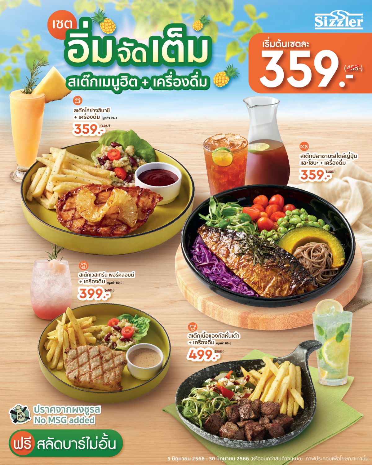 - เซตเมนูอิ่มจัดเต็ม สามารถเลือกเมนูสเต๊กที่ร่วมรายการ + เครื่องดื่มเมนูที่ร่วมรายการ 1 แก้วต่อเซต รายละเอียดเพิ่มเติม คลิก www.sizzler.co.th/th/promotion/223