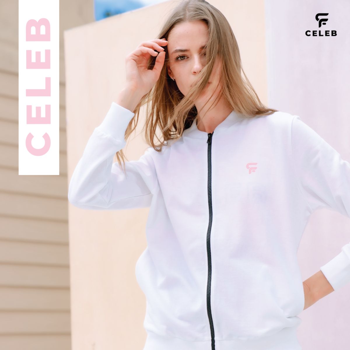 แบรนด์ CELEB น้องใหม่ ขอแนะนำ Celeb W Jacket โลโก้สีขมพูหวานเย็นบนเสื้อแจ็คเก็ตสีขาว น่ารักๆ เหมาะสำหรับสาวๆไว้ใส่ตอนอากาศเย็นๆ มิกซ์ แอนด์ แมท กับสไตล์ไหนก็เพิ่มความหวานในการแต่งตัวได้ทุกเมื่อ