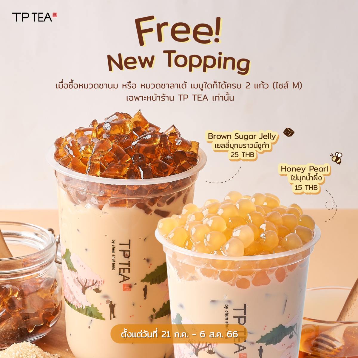 New Topping มีให้เลือก 2 Topping คือ Brown Sugar Jelly ราคา 25 บาท และ Honey Pearl ราคา 15 บาท