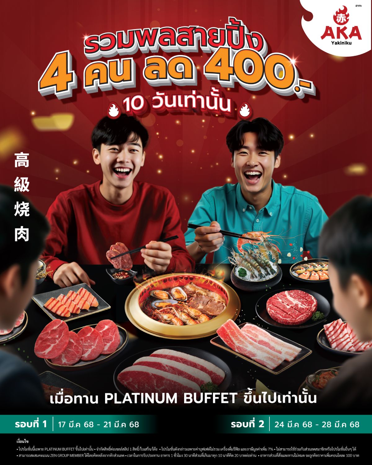 AKA ลดให้เลย 400 บาท เรียกรวมพลกันมาปิ้งย่างที่อากะ คุ้มขนาดนี้ ไม่ต้องคิดแล้ว ปิ้งกันให้ฟิน ลดกันให้มันส์ แค่ 10 วันเท่านั้น โอกาสดีแบบนี้ ไม่ต้องคิดแล้ว ชวนเพื่อนแล้วมาเลย โปรโมชั่นส่วนลดพิเศษเฉพาะ PLATINUM BUFFET เท่านั้น