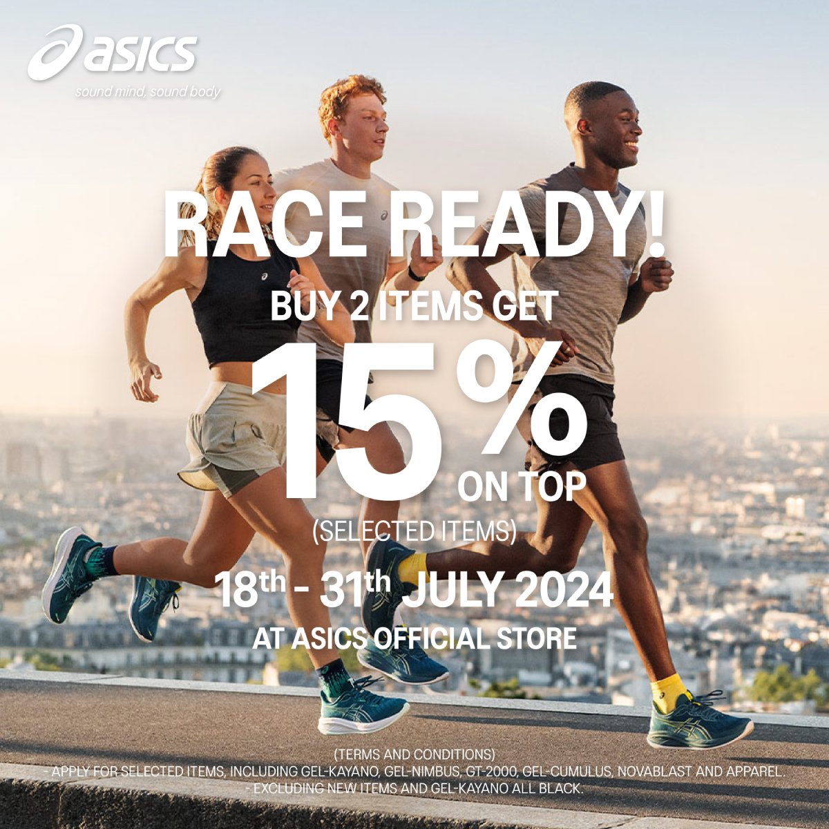 RACE READY รับส่วนลดพิเศษ 15% เมื่อช้อปรองเท้า Asics 2 คู่
