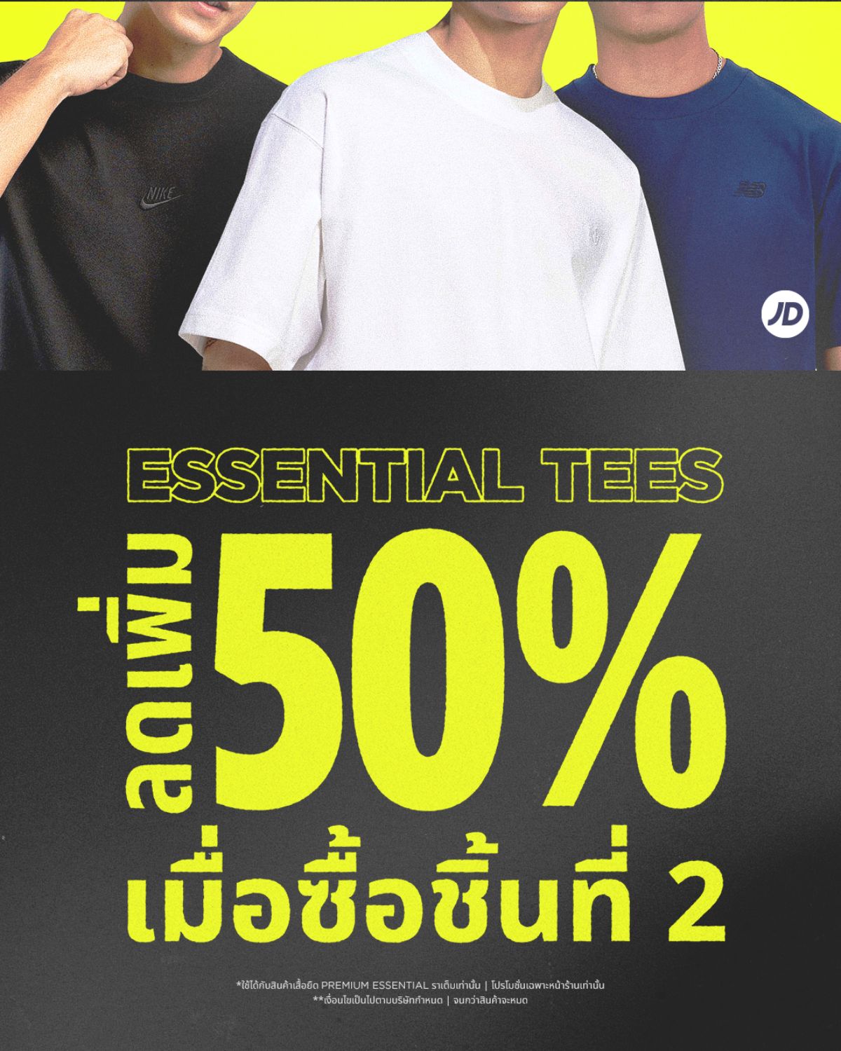 ซื้อคู่ถูกกว่า ลดทันที 50% เมื่อซื้อเสื้อยืด Premium Essential ชิ้นที่ 2 โปรโมชั่นนี้เฉพาะที่หน้าร้าน JD SPORTS เท่านั้น