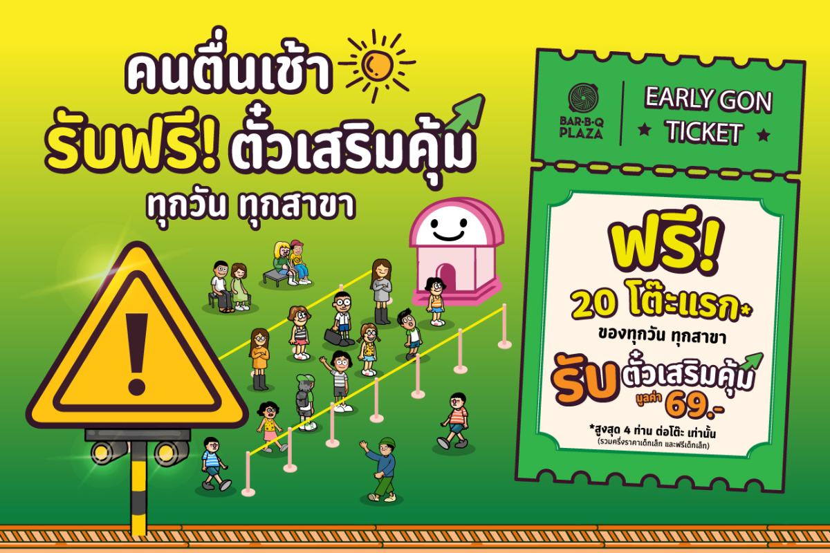 พิเศษ ! คนตื่นเช้า ฟรี! 20 โต๊ะแรก ของทุกวัน ทุกสาขา รับฟรี ตั๋วเสริมคุ้ม มูลค่า 69 บาท (สูงสุด 4 ท่าน ต่อโต๊ะเท่านั้น)