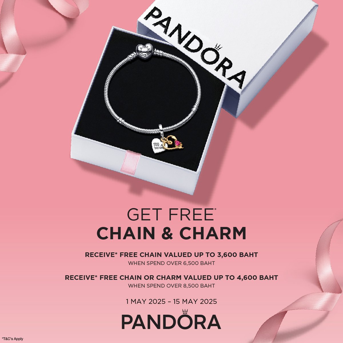 - เลือกรับ* สร้อยข้อมือ (Chain) หรือ ชาร์ม (Charm) มูลค่าสูงสุด 4,600 บาท* เมื่อช็อปสินค้าครบ 8,500 บาท