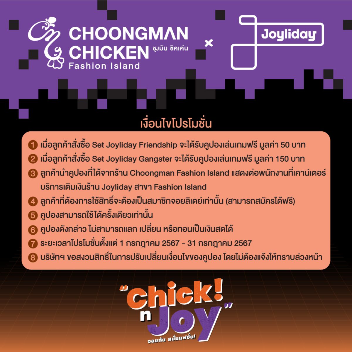 - เมื่อลูกค้าสั่งซื้อ Set Joyliday Friendship จะได้รับคูปองเล่นเกมฟรี มูลค่า 50 บาท