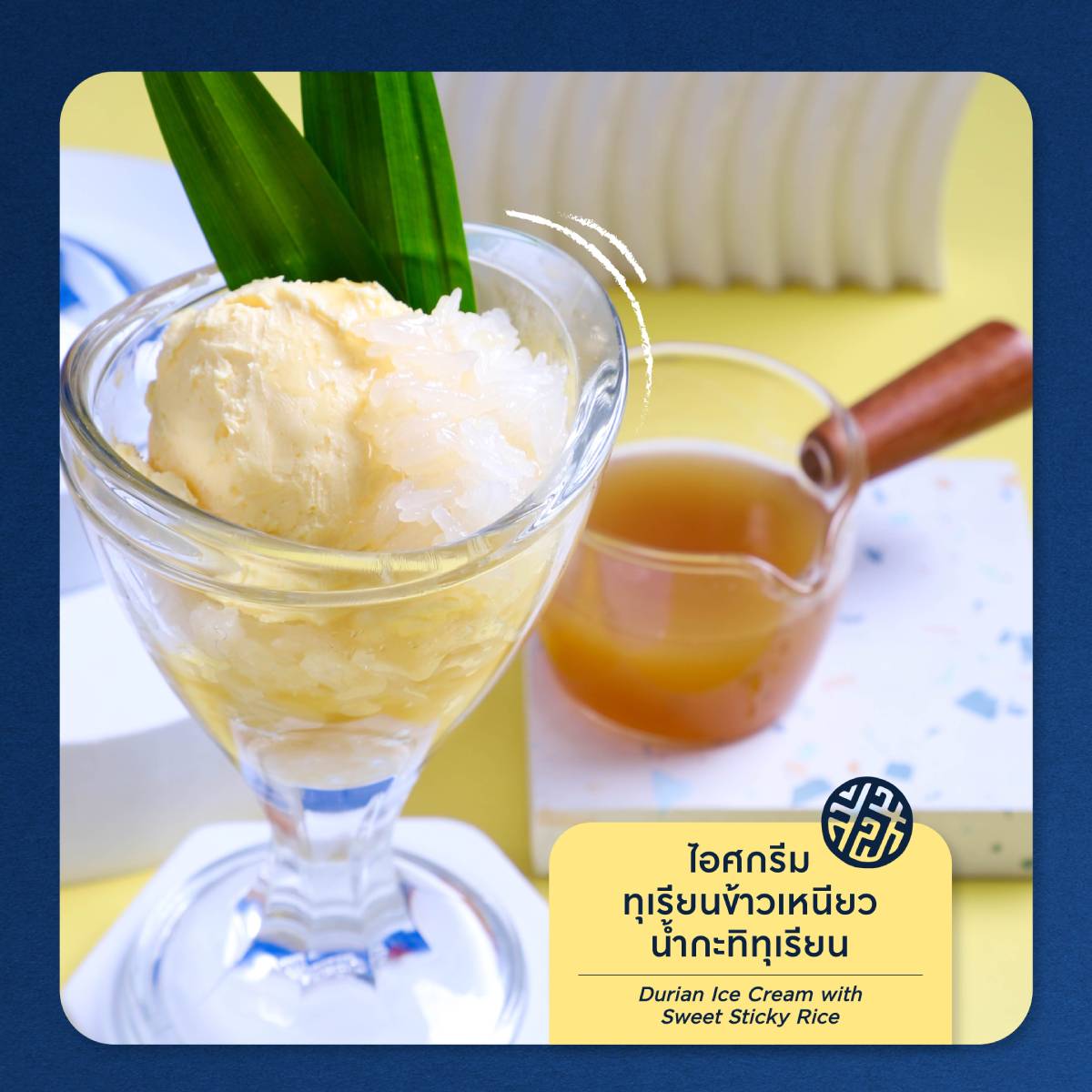 - ไอศกรีมทุเรียนข้าวเหนียวน้ำกะทิทุเรียน ไอศกรีมที่ได้รสสัมผัสเหมือนรับประทานทุเรียนจริง เสิร์ฟคู่ข้าวเหนียวมูนราดน้ำกะทิทุเรียนสูตรสีฟ้า ได้รสชาติเรียลข้าวเหนียวทุเรียน แต่เย็นสดชื่นคลายร้อน