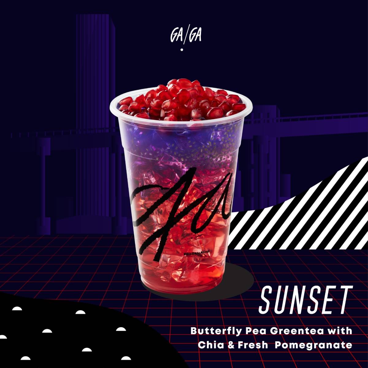 ชื่อเมนู Sunset (ซันเซ็ท) Butterfly Pea Greentea with Chia & Fresh Pomegranate