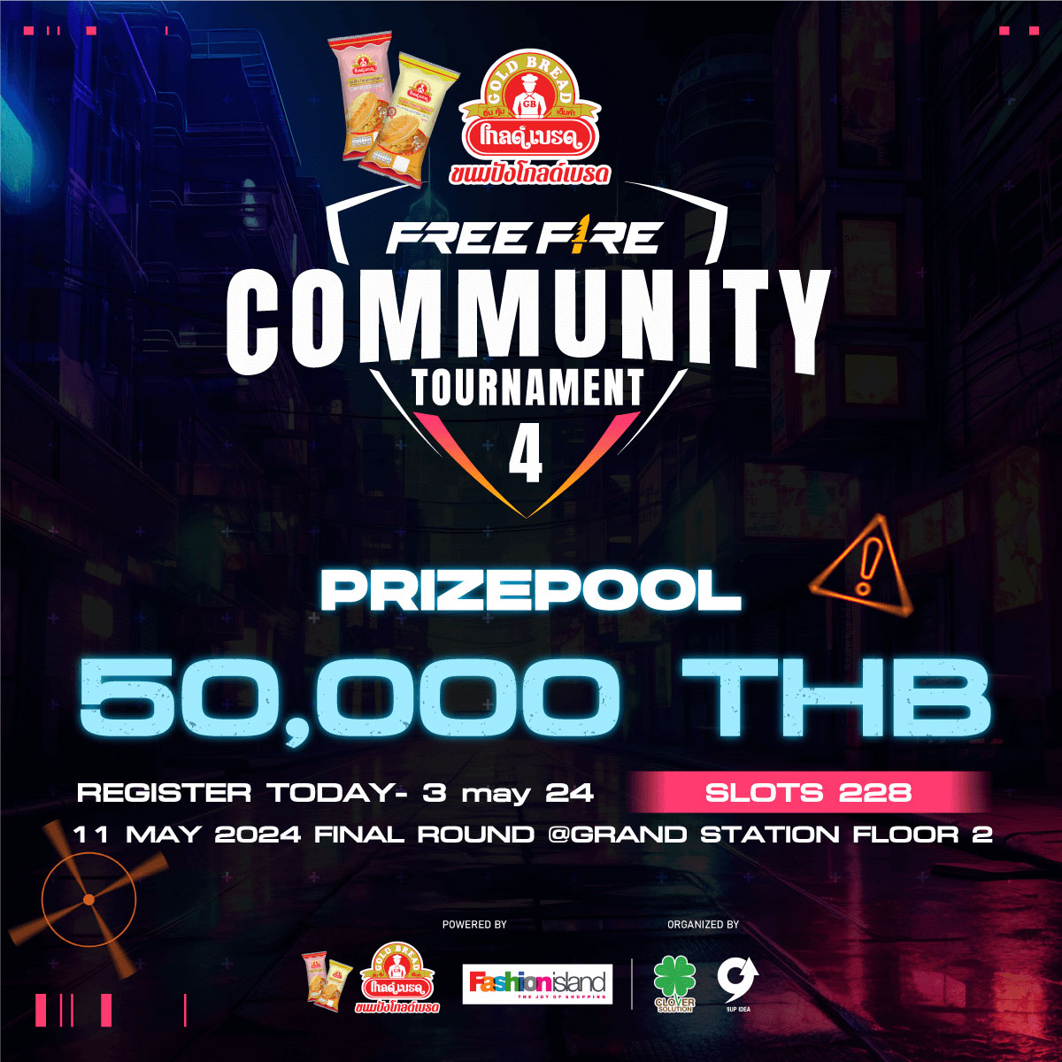 GoldBread FreeFire community Tournament #4พร้อมเปิดรับทุกทีมมาชิงเงินรางวัลรวมกว่า 50,000 บาทเเล้วตอนนี้ รีบสมัครกันเลยก่อนทีมจะเต็ม!!! เปิดรับสมัครตั้งแต่วันนี้ – 3 พฤษภาคม 2567 นี้เท่านั้น! รับสมัครจำนวน 288 ทีม