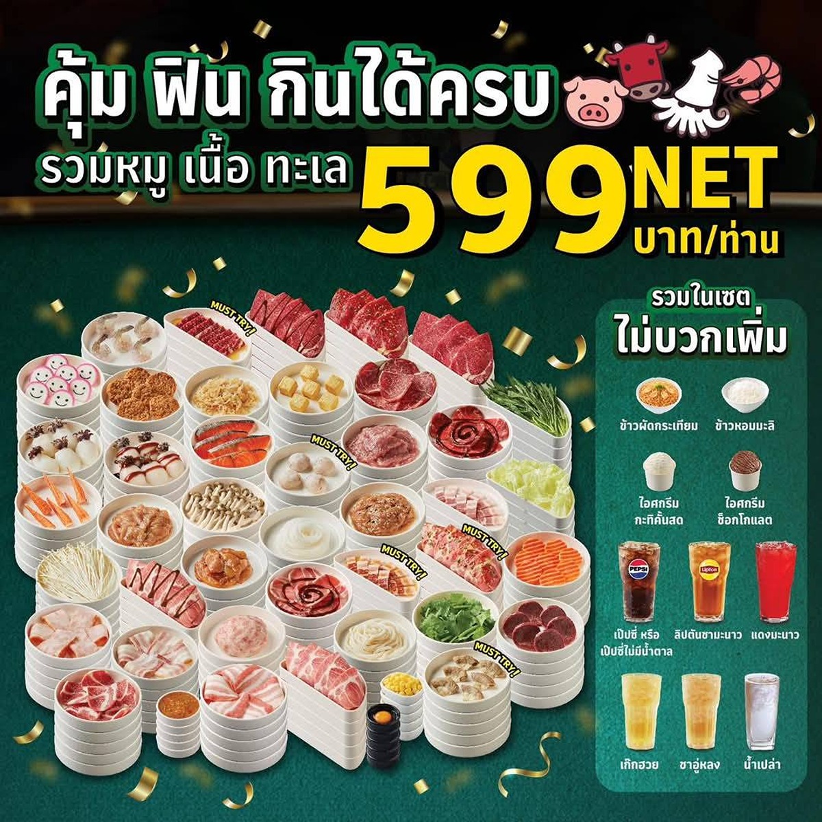 - 599.- Buffet รวมหมู เนื้อ และทะเล ALL IN อร่อยฟินทุกเมนูไปเล้ย
