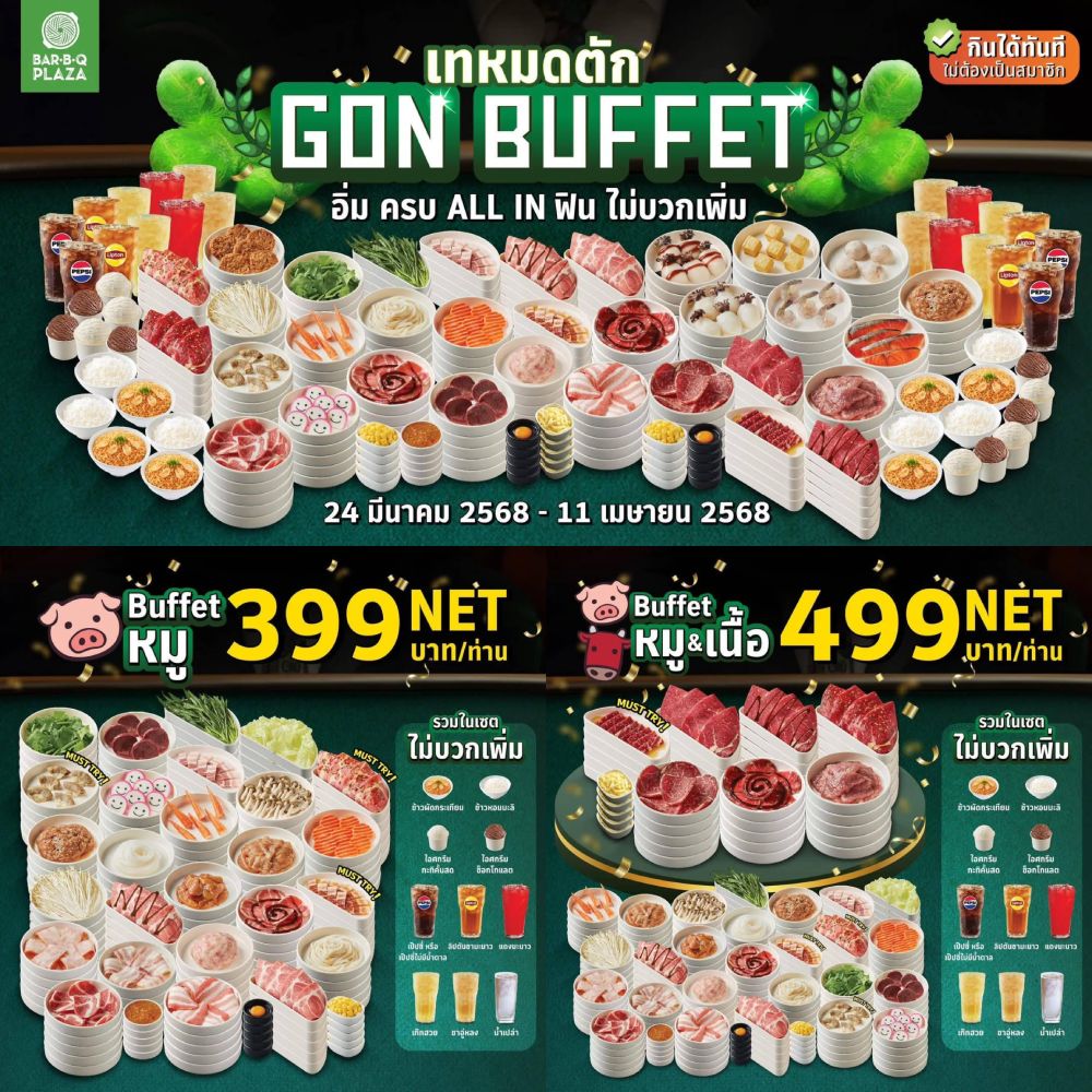 ราคานี้รวมข้าว น้ำ ไอศกรีม NET. ไม่บวกเพิ่ม มีเพื่อนแท็กเพื่อน มีแฟนแท็กแฟน มีญาติแท็กญาติ อิ่มครบแบบ ALL IN ไม่ต้องคิดเยอะ มาเจอกันได้เลย ย้ำราคานี้ ไม่มีบวกเพิ่ม กินได้ทันทีไม่ต้องเป็นสมาชิก GON Buffet เทหมดตัก อิ่ม ครบ ALL IN ฟิน ไม่บวกเพิ่ม