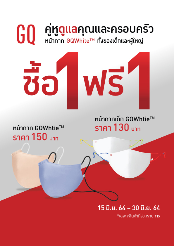 - ครั้งแรก! หน้ากากผ้า GQWhite™ Mask ทั้งขนาดเด็กและผู้ใหญ่ ซื้อ 1 แถม 1
