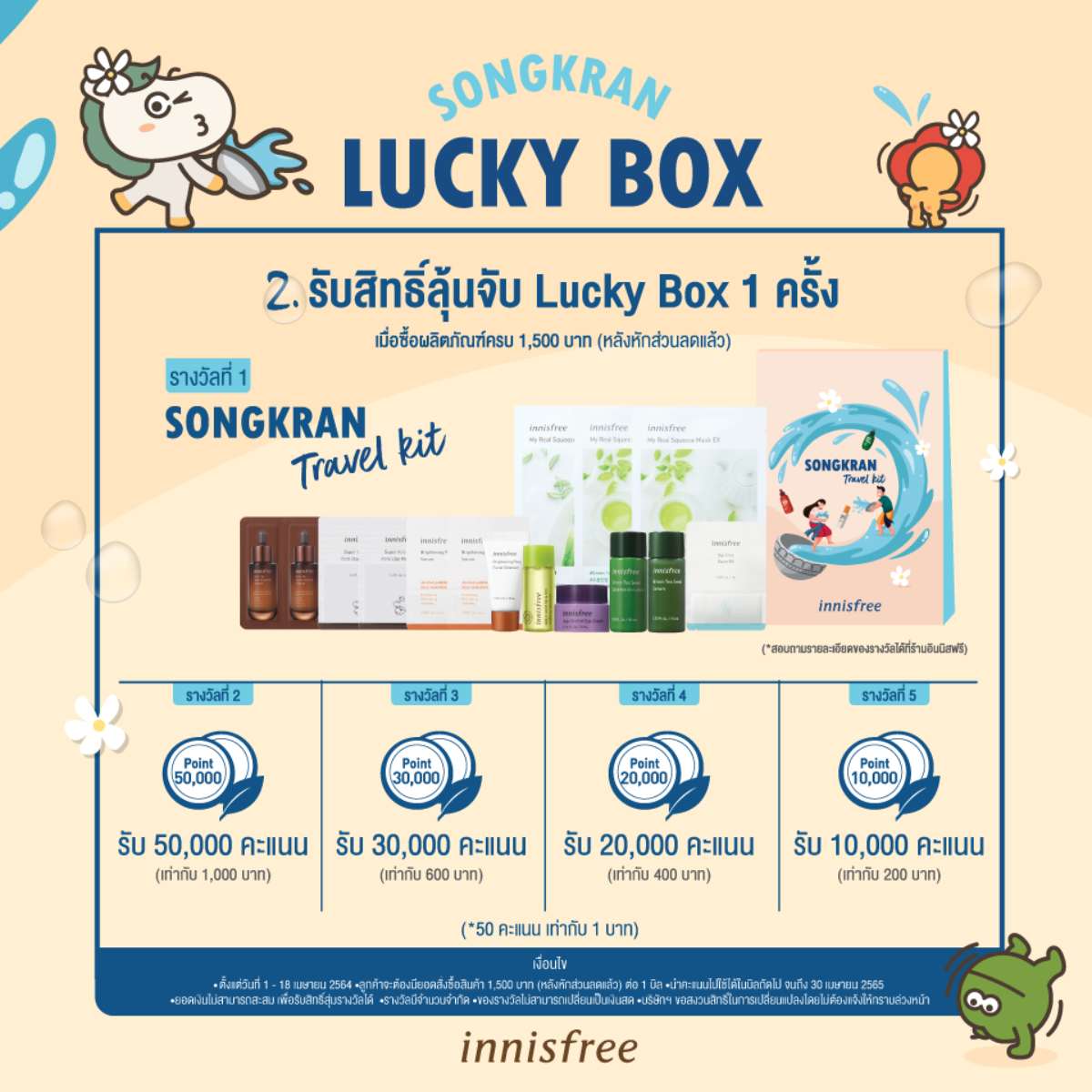 – Songkran Lucky Box สำหรับลูกค้าทั่วไป เพียงซื้อสินค้าใด มูลค่าครบ 1,500 บาท รับสิทธิ์ลุ้นจับ Lucky Box 1 ครั้ง พร้อมลุ้นรับกล่อง Songkran Travel Kit ฟรี หรือลุ้นสะสมแต้มสูงสุดถึง 50,000 คะแนน