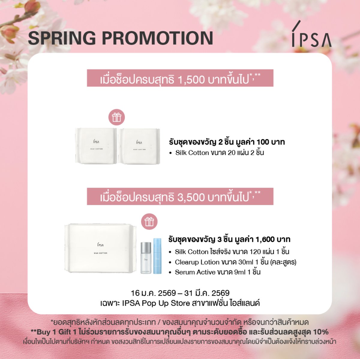 - รับ Silk Cotton มูลค่า 100 บาท เมื่อช็อปครบสุทธิ 1,500 บาทขึ้นไป*,**