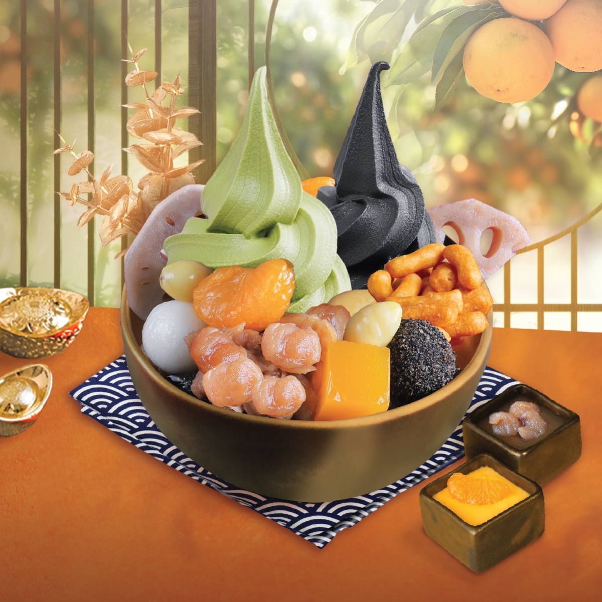 ชุดโรลเค้กส้ม 3 สายพันธุ์ สอดไส้ดับเบิ้ลครีมสด 2 สี 2 รสชาติ จากส้มมิกัน และส้มซันคิสท์ แทรกด้วย ‘ส้มซาถัง’ จักรพรรดิเต็มลูก ท็อปปิ้งส้มสดและวุ้นคันเต็น รสส้มมิกัน ได้ความเปรี้ยวอมหวานเต็มๆรสส้ม ตกแต่งด้วยลายอักษรจีนมงคล แปลว่า
