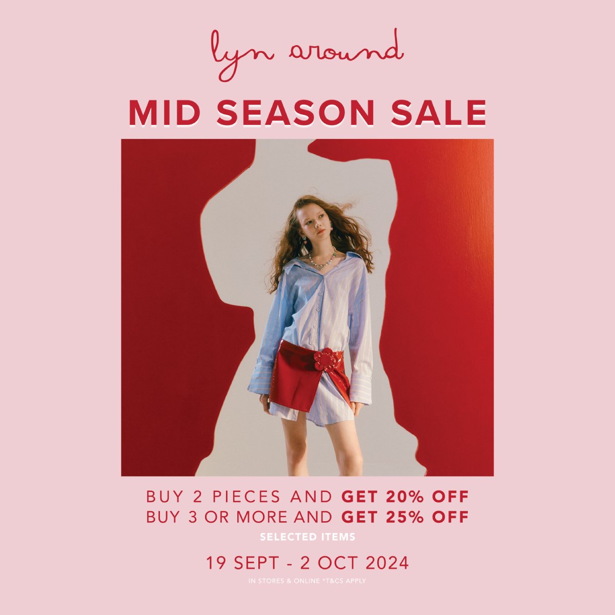 ห้ามพลาด Lyn Around Mid-Season Sale จัดโปรโมชั่นให้แบบจุกๆ เมื่อซื้อ 2 ชิ้นรับส่วนลดไปเลย 20% หรือซื้อ 3 ชิ้นขึ้นไปลดไปเลย 25% เอาใจแฟนคลับ ลิน อราวนด์ ให้ได้ช้อปกันแบบจุใจ อย่าลืมชวนเพื่อนๆ มาช้อปด้วยกันนะ