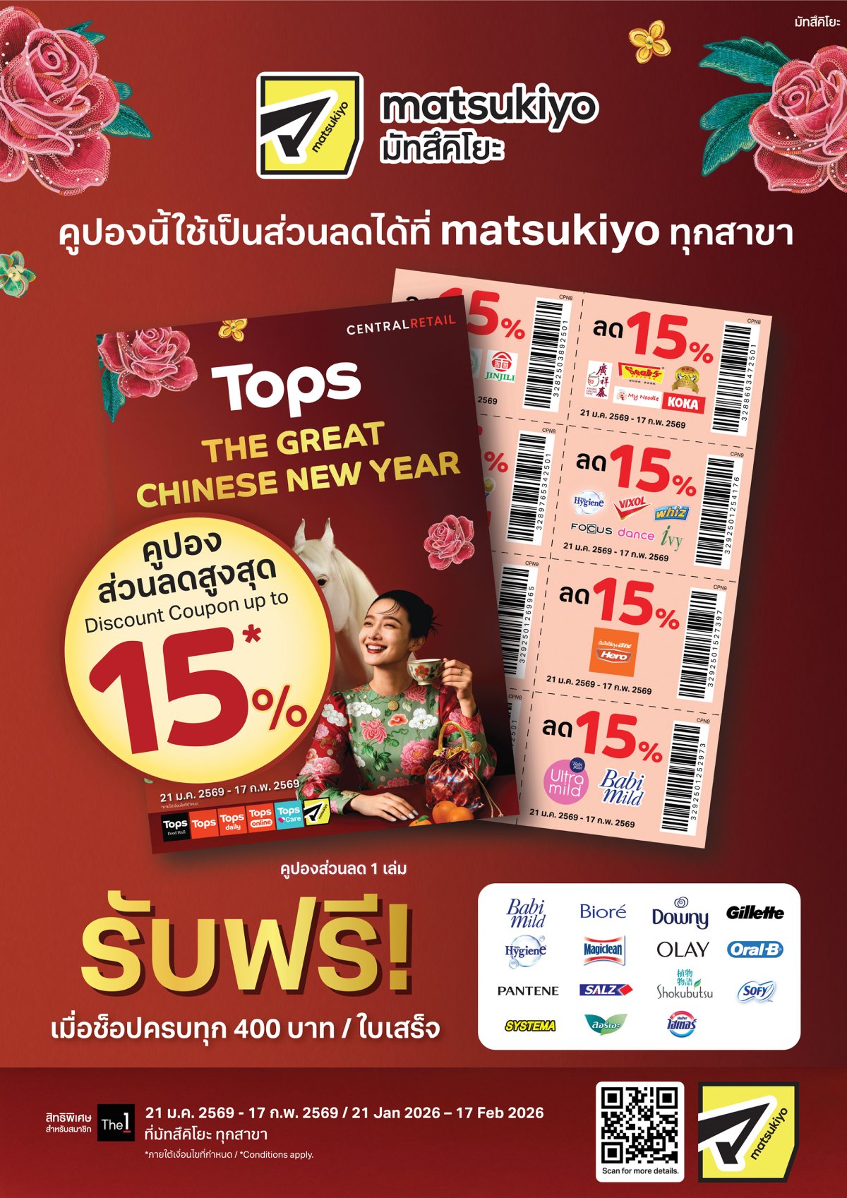 เฮงรับตรุษจีน คุ้มตั้งแต่ใบเสร็จแรก ช้อปฉลองปีใหม่จีนที่ Matsukiyo รับความคุ้มแบบต่อเนื่อง ด้วยคูปองส่วนลดจากแคมเปญ TOPS The Great Chinese New Year