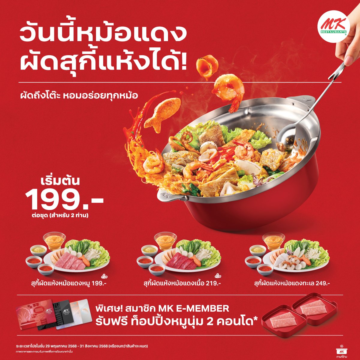 เนื้อสัตว์วัตถุดิบคุณภาพ พิเศษ สมาชิก MK E – MEMBER รับฟรี ท็อปปิ้งหมูนุ่ม 2 คอนโด เมื่อสั่งชุดเมนูสุกี้ผัดแห้งหม้อแดงชุดใดก็ได้