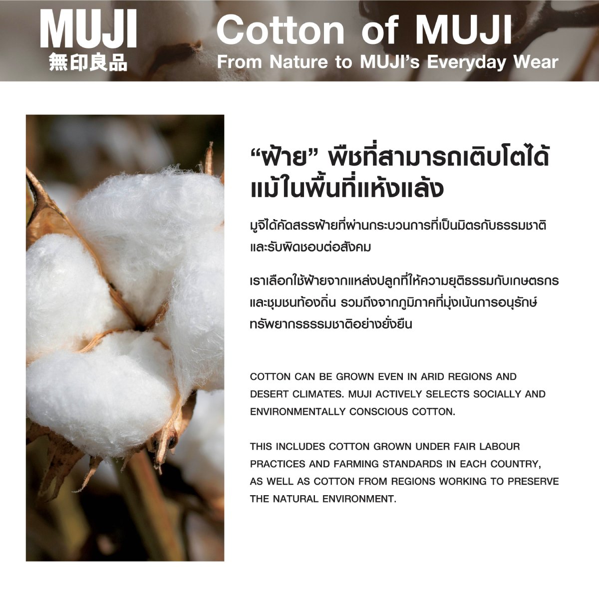 มูจิได้คัดสรรฝ้ายที่ผ่านกระบวนการที่เป็นมิตรกับธรรมชาติและรับผิดชอบต่อสังคม เราเลือกใช้ฝ้ายจากแหล่งปลูกที่ให้ความยุติธรรมกับเกษตรกรและชุมชนท้องถิ่น รวมถึงจากภูมิภาคที่มุ่งเน้นการอนุรักษ์ทรัพยากรธรรมชาติอย่างยั่งยืน⁣