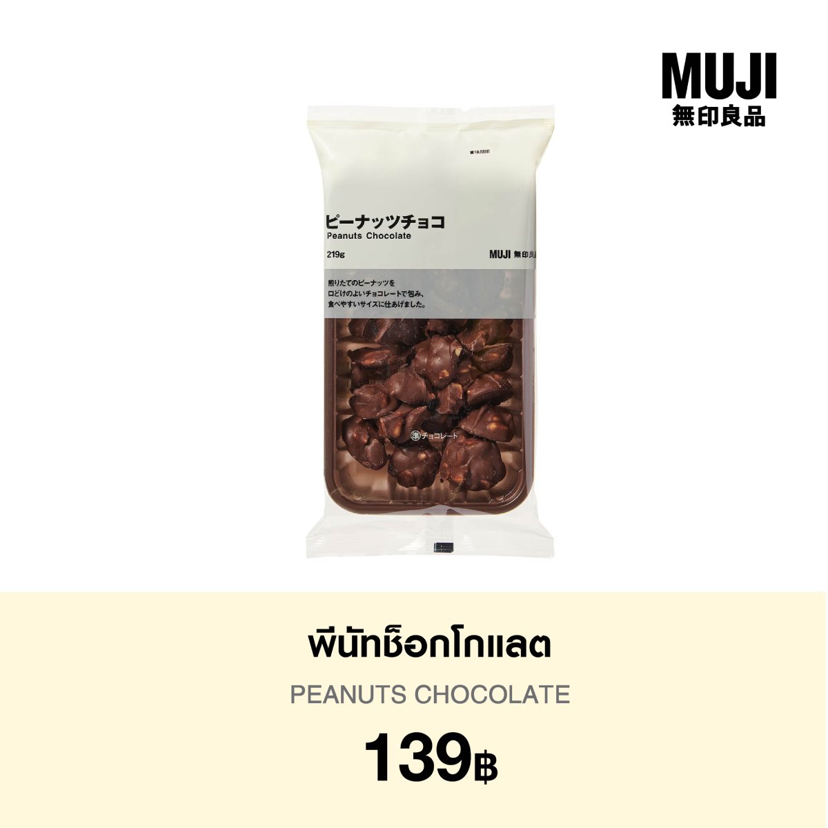 ขนมอร่อยที่มูจิอยากแนะนำให้ทุกคนได้ลอง กรุบกรอบและหอมมันจากถั่วลิสง (Peanut) พร้อมเคลือบช็อกโกแลตเข้มข้นหวานกำลังดี กัดเข้าไปแล้วรสชาติกลมกล่อม ลงตัวที่สุด PEANUTS CHOCOLATE พีนัทช็อกโกแลต