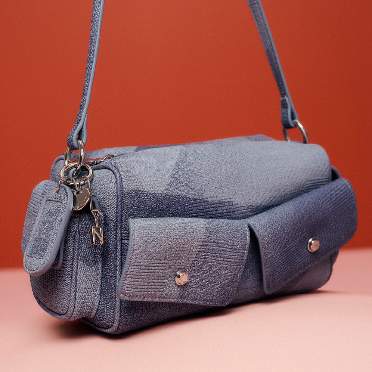 กระเป๋าทรงสี่เหลี่ยมยาวดีไซน์โมเดิร์น ผสานความหรูหรากับฟังก์ชันด้วยพ็อคเก็ตหมุดโลหะใช้งานได้จริง วัสดุหนังคลาสสิกและเดนิมลายพิเศษ เติมเสน่ห์ด้วยแท็ก LYN ชิ้นเล็ก เหมาะสำหรับลุคเรียบหรูที่มีเอกลักษณ์ทุกวัน