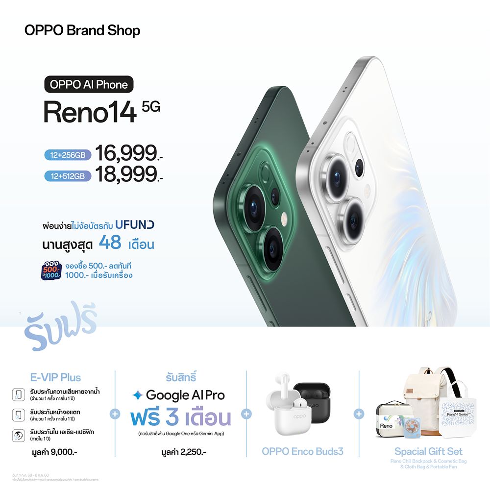 พิเศษ : รับฟรี E-VIP Plus 9,000 บาท พร้อมมูลค่าสิทธิ์ Google AI Pro ฟรี 3 เดือน จำนวนมูลค่า 2,250 บาท พร้อม Reno Chill backpack มูลค่า 2,999 บาท ฟรี!