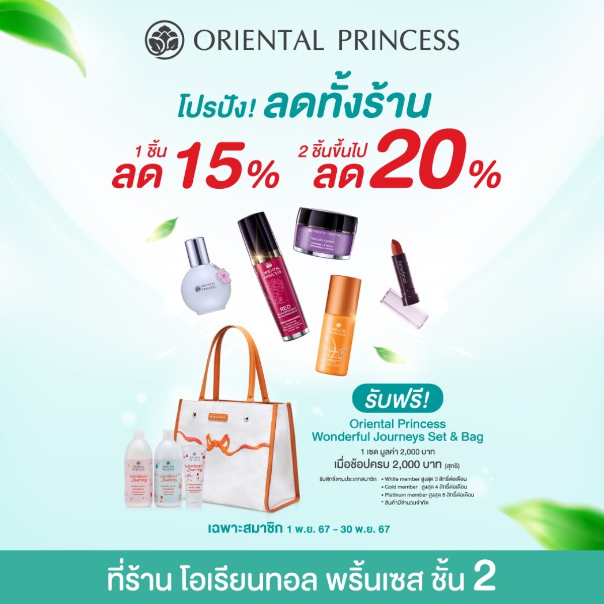 โปรปัง ลดทั้งร้าน 1 ชิ้น ลด 15% 2 ชิ้นขึ้นไป ลด 20% เฉพาะสมาชิก พิเศษ รับฟรี Oriental Princess Wonderful Journeys Set & Bag มูลค่า 2,000 บาท เมื่อช้อปครบ 2,000 บาท (สุทธิ) (รับสิทธิ์ตามประเภทสมาชิก)