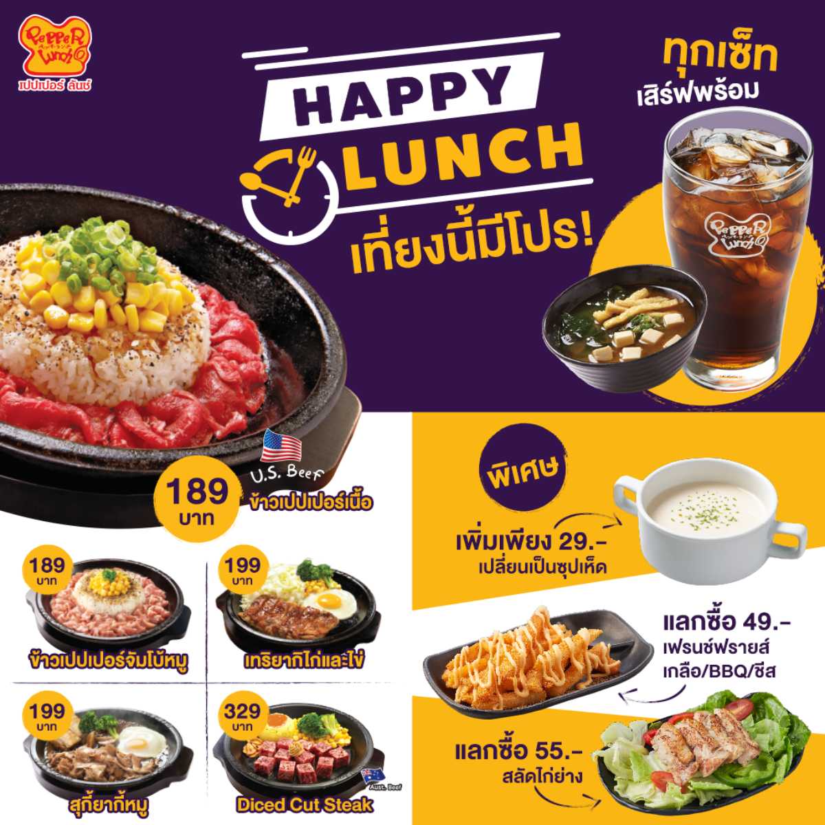 เปปเปอร์ ลันช์ ขอนำเสนอ เพราะโปร Happy Lunch ที่หลายคนเรียกร้องกลับมาแล้วจ้า อิ่มคุ้มสุดประหยัดตั้งแต่ร้านเปิดจนบ่ายสาม พร้อมซุปมิโซะและเครื่องดื่มทุกเซ็ท ตอนนี้ใครทานที่ร้านไม่ได้ มาซื้อกลับไปทานที่บ้าน ก็คุ้มเหมือนกันน้าา เพียงเพิ่มเงิน 10 บาท เท่านั้น