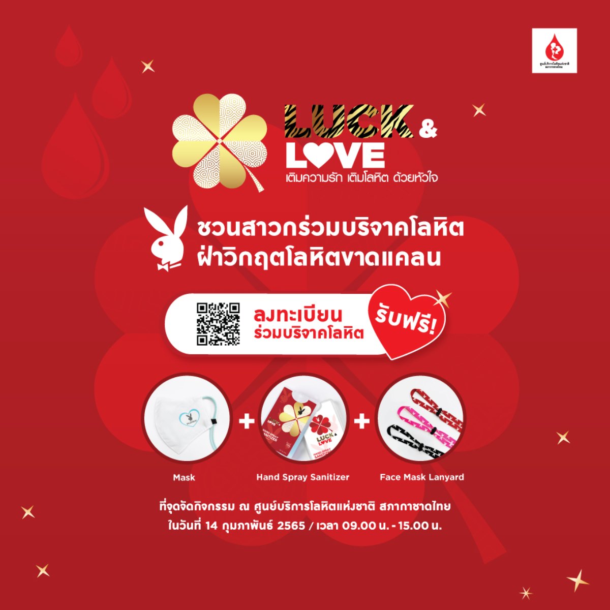 PLAYBOY Luck & Love “เติมความรัก เติมโลหิตด้วยหัวใจ” ขอเชิญชวนสาวกทุกท่านรวมพลังเป็นผู้ให้ที่ยิ่งใหญ่ บริจาคโลหิตในวันแห่งความรัก วันวาเลนไทน์ 14 ก.พ. 2565 เวลา 09.00-15.00 น. ณ ศูนย์บริการโลหิตแห่งชาติ สภากาชาดไทย พิเศษ! รับของที่ระลึกจากแบรนด์ PLAYBOY ฟรี!