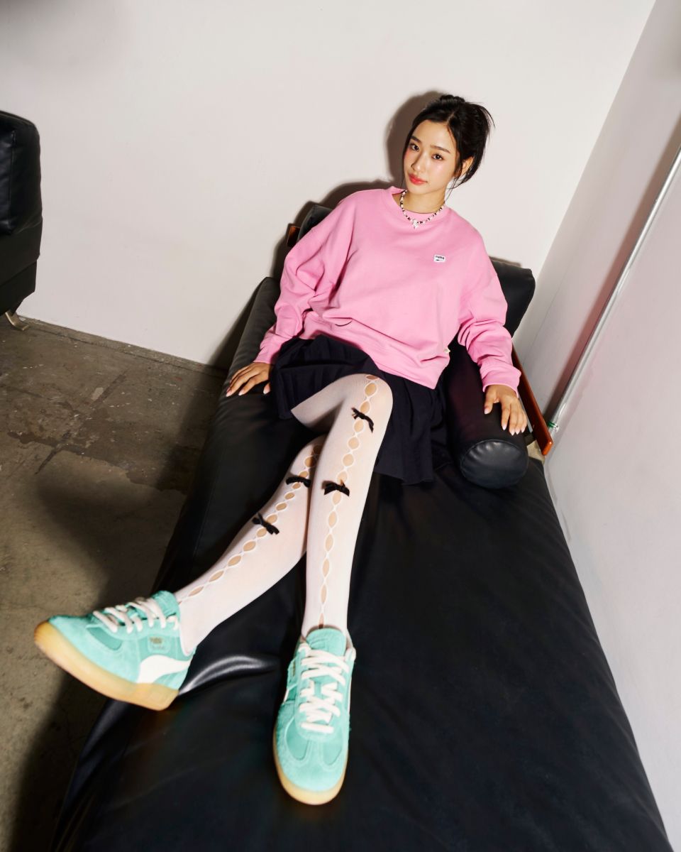 ในขณะเดียวกัน ตู ต้นตะวัน สวมใส่รองเท้า PUMA รุ่น Palermo Vintage สีเขียวมินต์ Jade Frost สุดน่ารัก