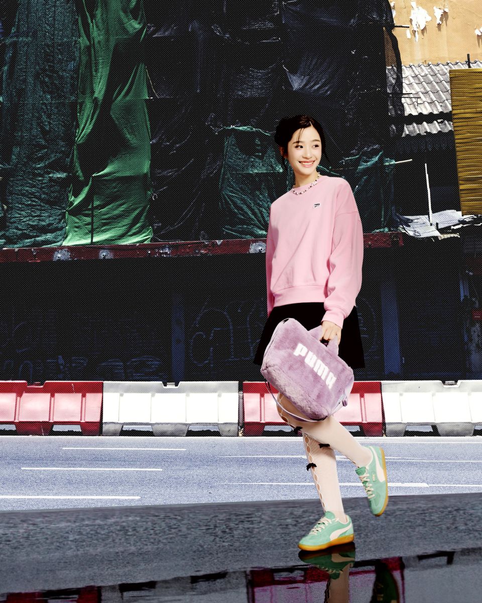 จับคู่กับเสื้อสเวตเตอร์สีชมพู โลโก้ PUMA สีดำอันโดดเด่น ที่ถ่ายทอดคาแรกเตอร์ที่สดใสออกมาอย่างลงตัว