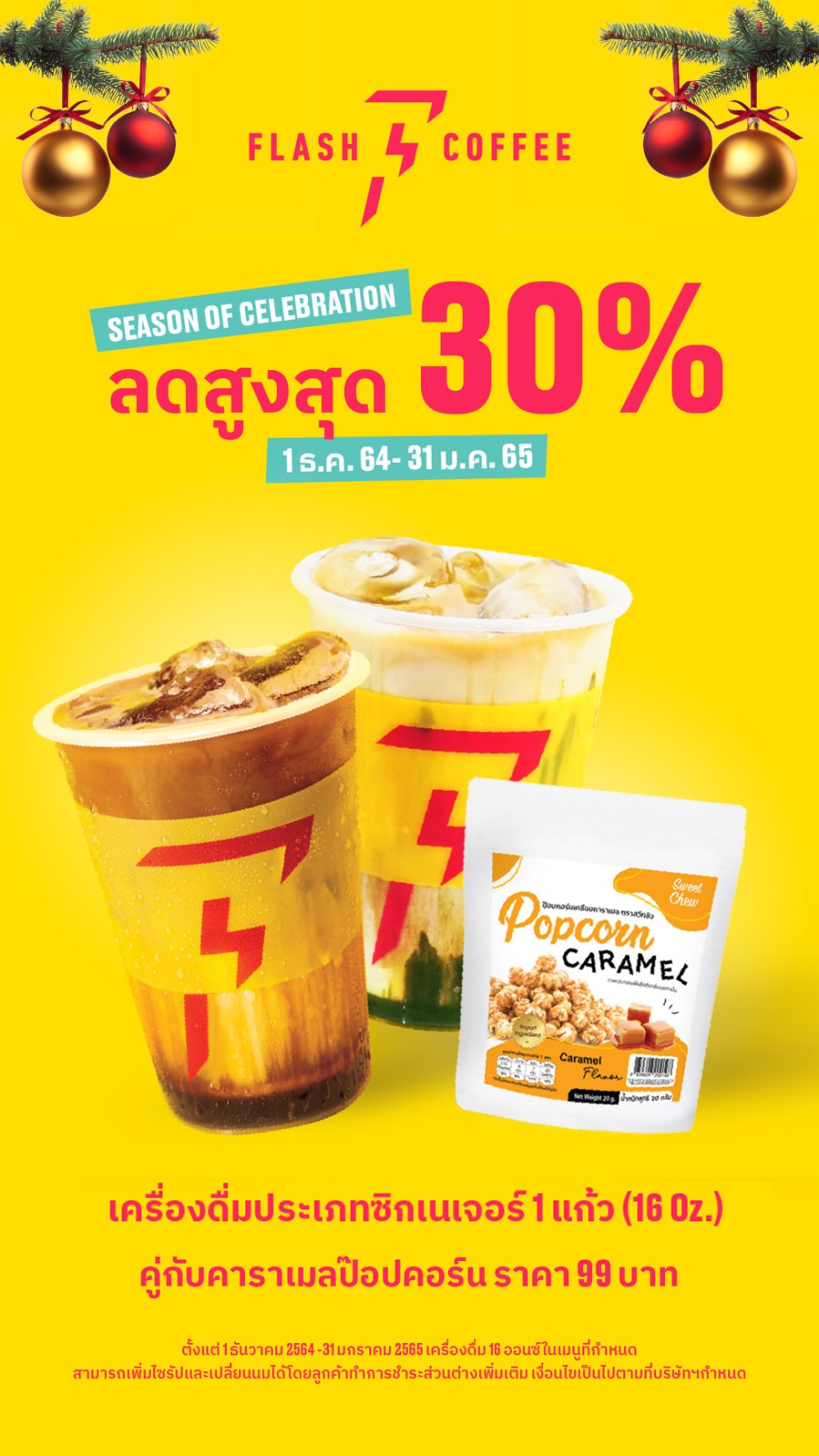- เฉพาะการสั่งซื้อหน้าร้านและผ่านแอป Flash Coffee เท่านั้น เครื่องดื่ม 16 ออนซ์. หมวดหมู่ซิกเนเจอร์ลาเต้ 1 แก้ว จากรายการที่กำหนดคู่กับ พรีเมียมคาราเมลป๊อปคอร์น 1 ถุง ในราคา 99 บาท