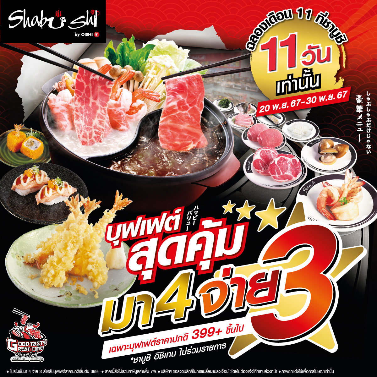 #11วันเท่านั้น ฟินฉ่ำๆ กับโปรโมชั่นแห่งปีจาก SHABUSHI “มา 4 จ่าย 3 เมื่อใช้บริการบุฟเฟต์ครบทุกๆ 4 ท่าน/ใบเสร็จ”