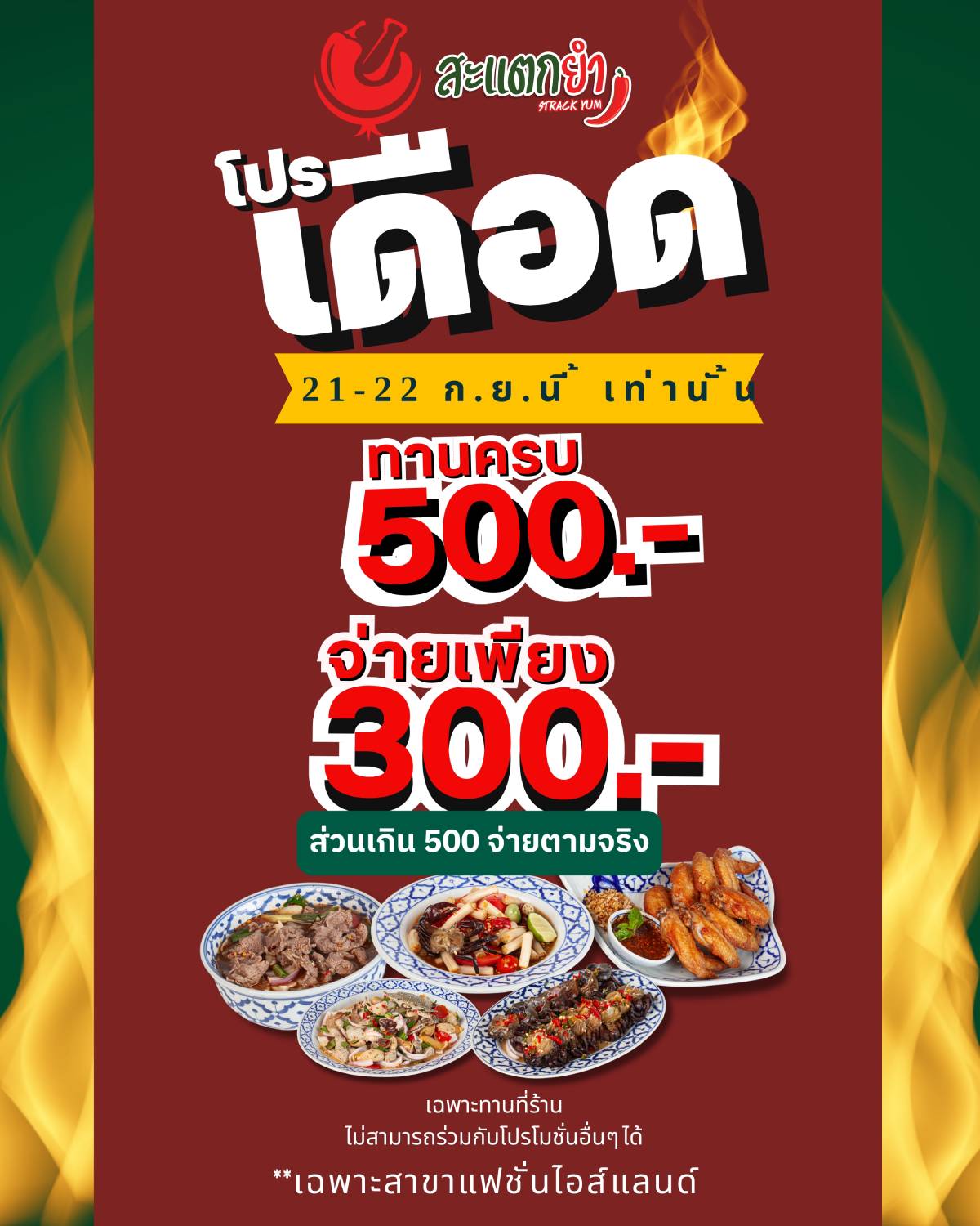 โปรเดือด ที่ต้องรีบไปจองโต๊ะ กับโปร ทานครบ 500 บาท จ่ายเพียง 300 บาท ส่วนเกิน 500 บาท จ่ายตามจริง ไม่อยากพลาดโปรเดือดๆแบบนี้ ต้องรีบไปใช้สิทธิ์ให้คุ้มจุกๆแล้ว