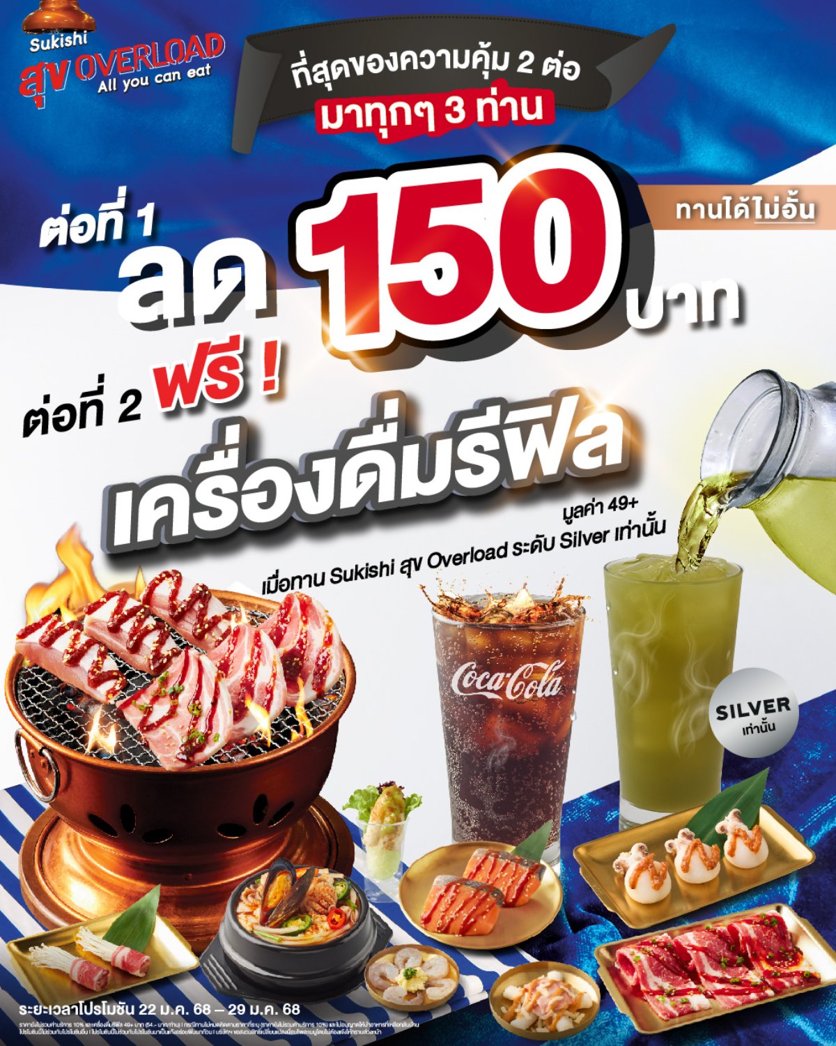 • โปรโมชันมาทุกๆ 3 ท่าน รับส่วนลด 150 บาท + ฟรีเครื่องดื่มรีฟิล 1 ที่ 49+ บาท (54.-) เมื่อทาน Sukishi สุข Overload ระดับ Silver เท่านั้น