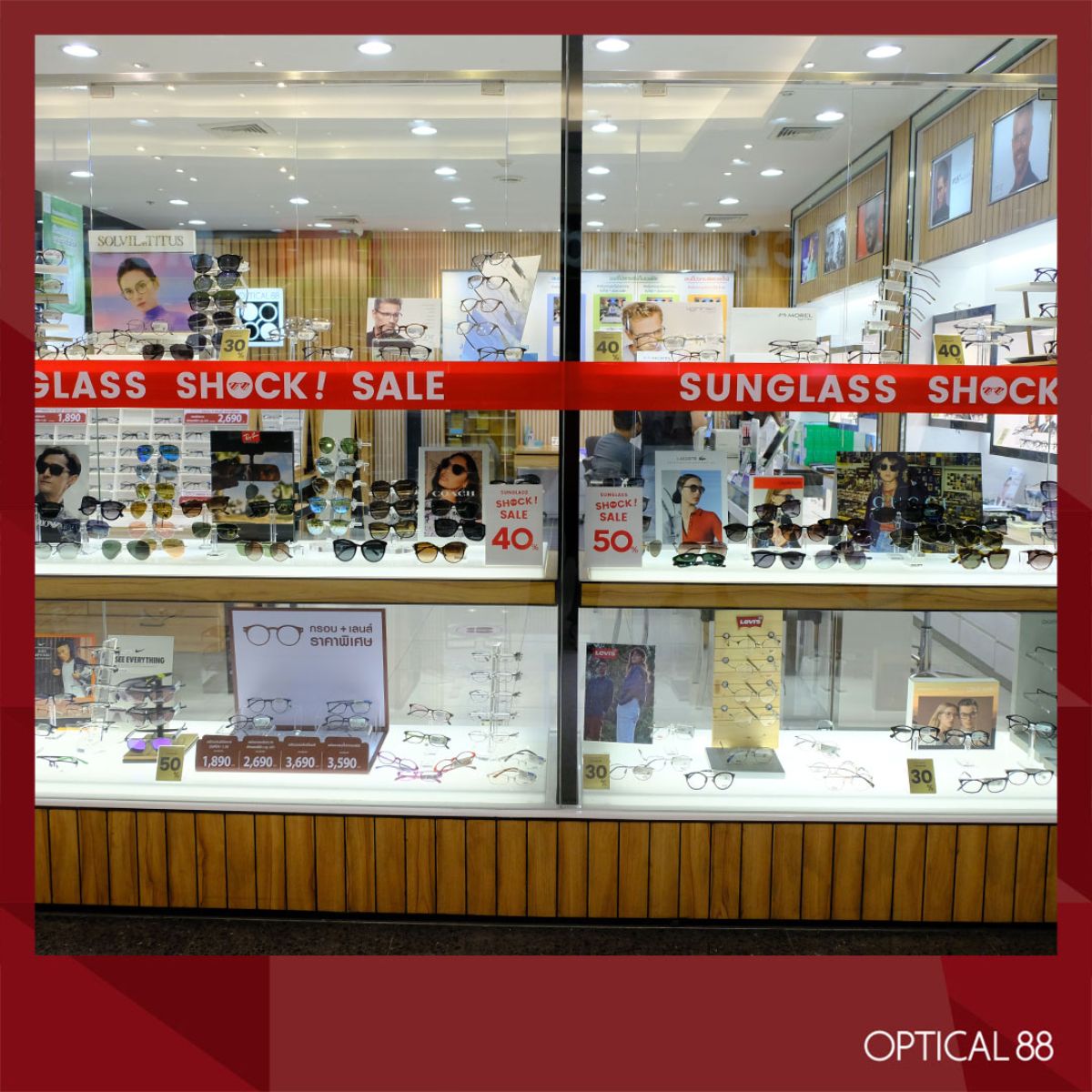 มีให้เลือกอย่างจุใจ พร้อมส่วนลดสูงสุดถึง 50% อาทิ Lacoste, Hugo Boss, Gucci, Levi’s, CK, Oakley, Rayban, Prada, Nike, Titus, Cyma, Must, IC! Berlin, Coach, EA, GA, Longchamp, Porsche Design และแบรนด์อื่นๆ