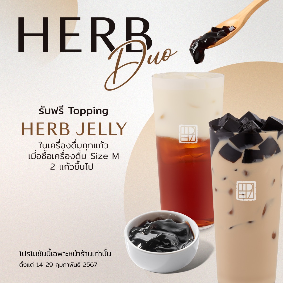 รับฟรี Topping herb jelly ในเครื่องดื่มทุกแก้ว เมื่อซื้อเครื่องดื่ม Size M 2 แก้วขึ้นไป